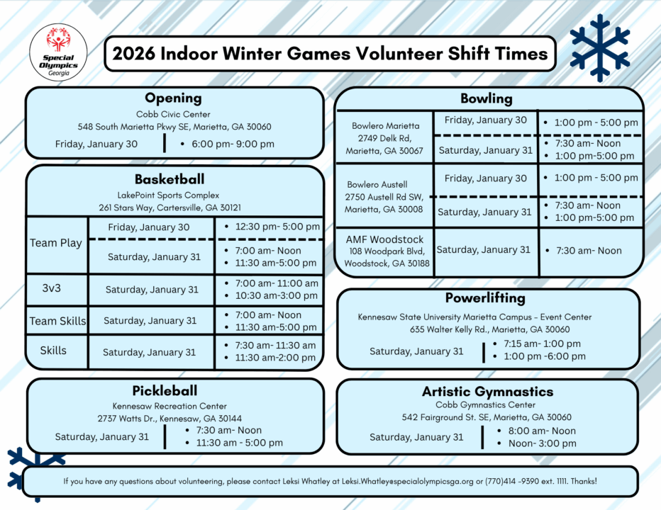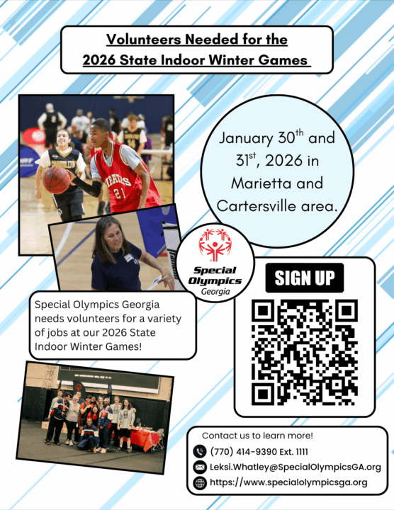 Join Special Olympics Georgia and the 2,000 athletes competing at the State Indoor Winter Games January 30-31, 2026 in Cobb County, GA by volunteering! We need volunteers to help with bocce, softball, golf, and cycling. To sign up CLICK HERE or email Leksi Whatley at leksi.whatley@specialolympicsga.org.